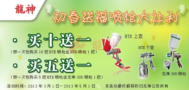 吉尼斯HTE噴槍“初春送?!贝黉N活動方案 2013-03-01 27633 吉尼斯HTE噴槍“初春送?!贝黉N活動方案 (產(chǎn)品編號:30282000-30286000) 2013年3月份市場促銷方案如下:一、主題:“初春送福”噴槍大讓利。二、活動時間:1、 時間:2013年03月1日至2013年05月1日 2、 時長:共計2個月 三、活動內(nèi)容:1、 買十送一(即一次購買十把HTE噴槍送一把HTE噴槍)2、 買五送一(即一次購買五把HTE噴槍送一把龍神305噴槍)四、具體操作方案 1、購買十把HTE噴槍送一把HTE噴槍 2、買五把HTE噴槍送一把龍神305噴槍 (以上二個方案具體促銷方式可按增量的形成搭配)